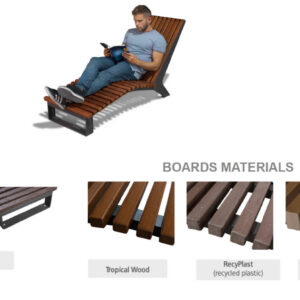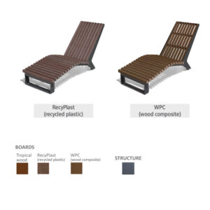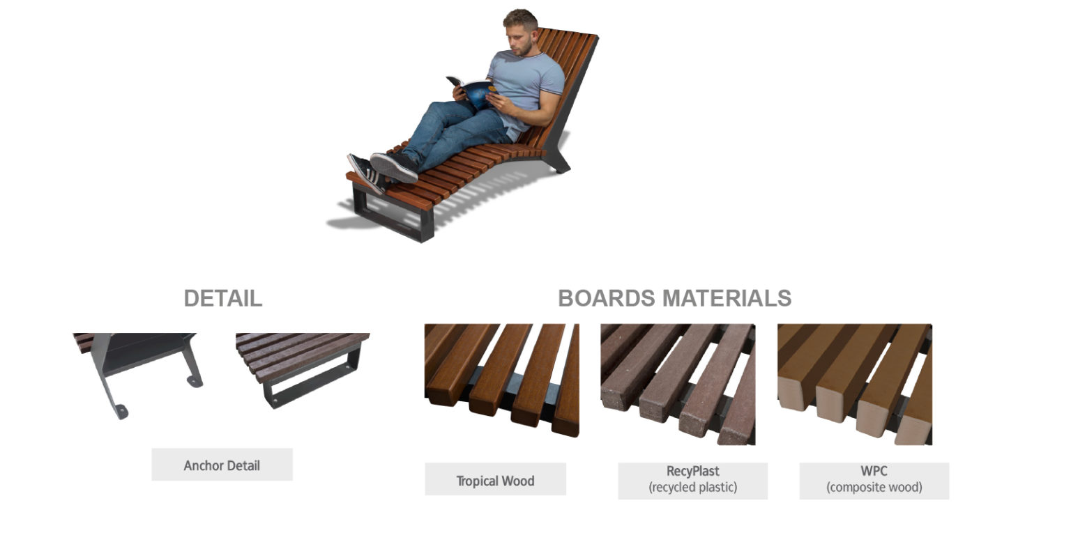 Kaasaegse disainiga lamamistool avalikku ruumi. Tsingitud terasest konstruktsioon ja valik puidu, WPC-komposiidi või taaskasutatud plastikuga istumisosast. Sobib parkidesse, promenaadidele ja linnaruumi.
