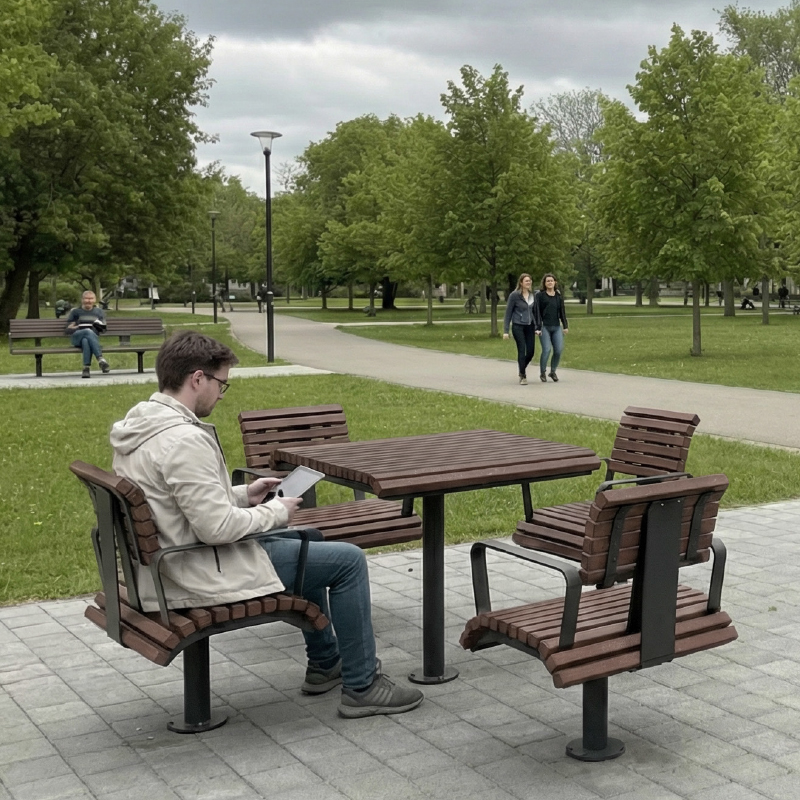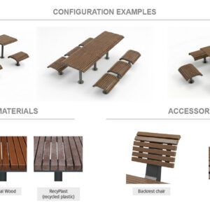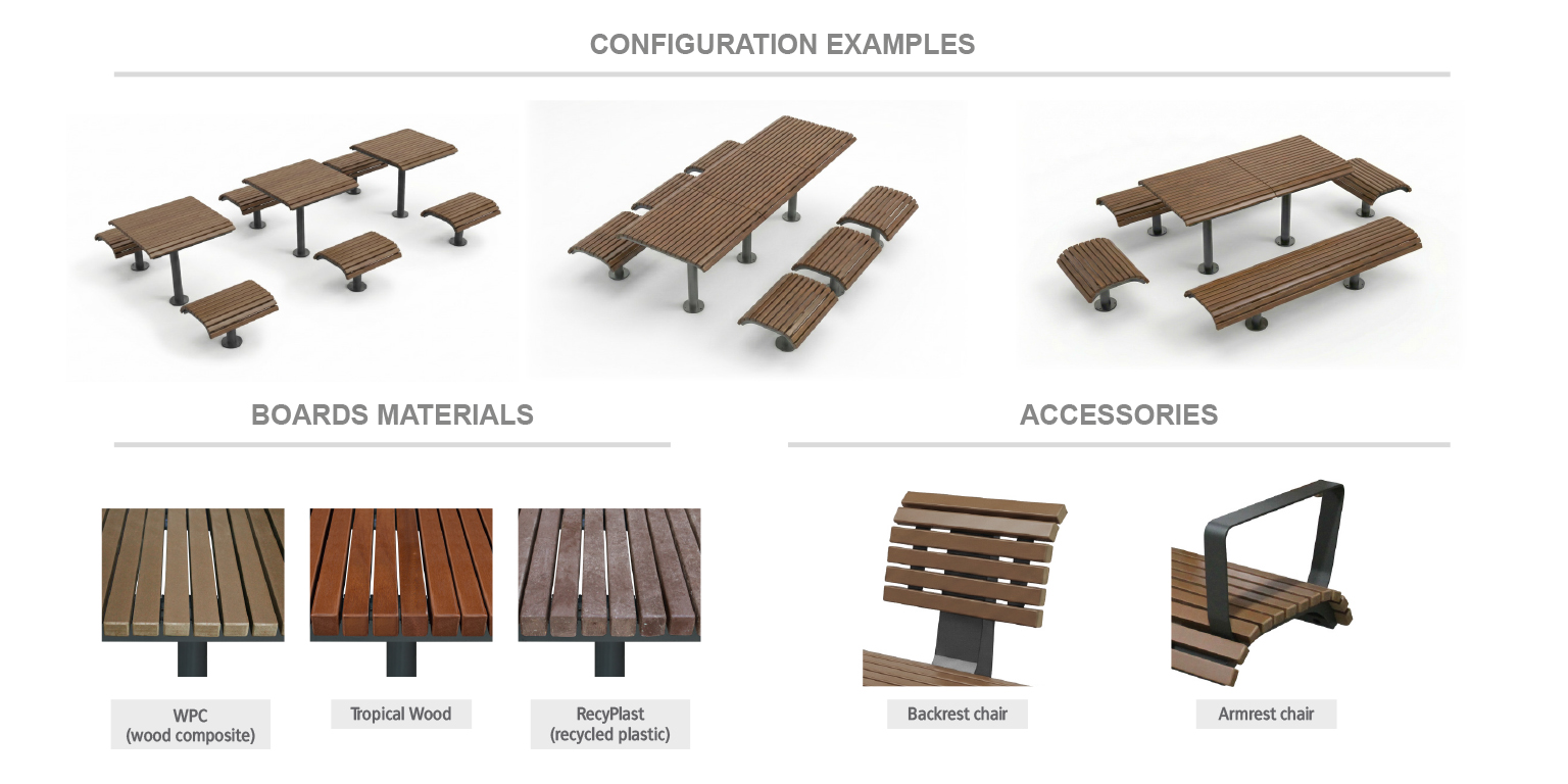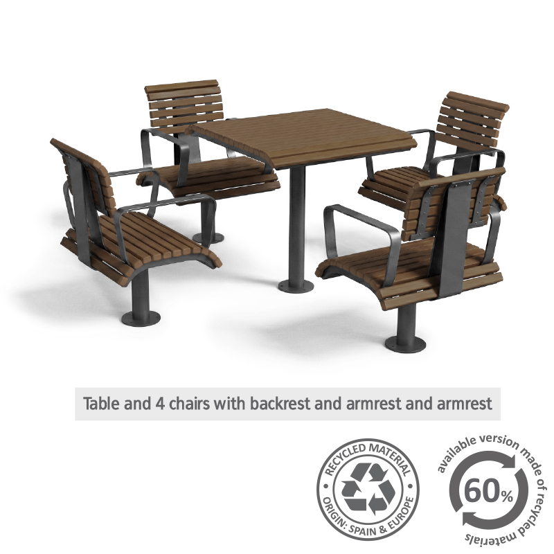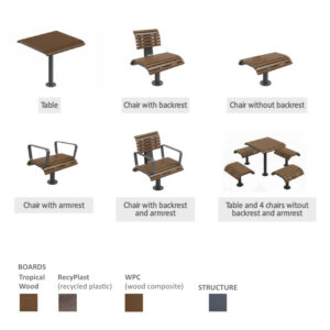Komplekti kuuluvad laud ja toolid, mida saab paigaldada eraldi elementidena. Ühe laua ümber on võimalik paigaldada kuni neli tooli, üks igale küljele, luues mugava istumisala suhtlemiseks, puhkamiseks või töötamiseks välitingimustes.