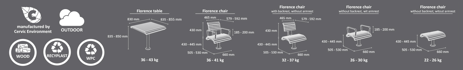 Florence laud ja toolid on kaasaegse disainiga linnamööbli lahendus, mis sobib suurepäraselt parkidesse, linnaväljakutele, promenaadidele, jalakäijate aladele ja avalikele puhkealadele.