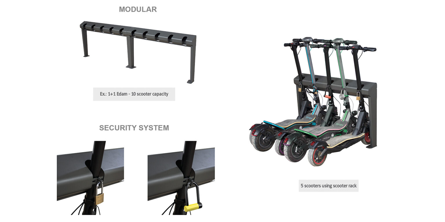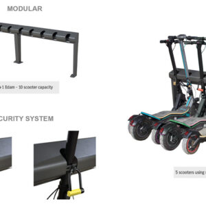 Hoidja võimaldab parkida kuni viis elektrilist või tavalist tõukeratast ning sisaldab turvalist lukustussüsteemi, mis võimaldab kasutada tabalukku, ketti, kaablit või D-lock lukku (lukud ei kuulu komplekti).